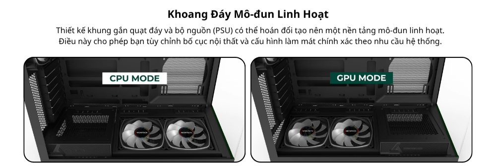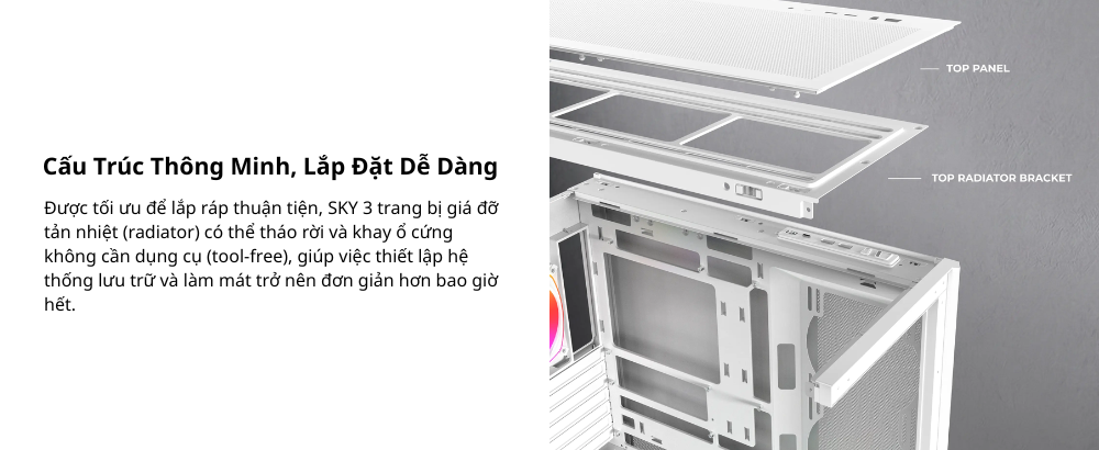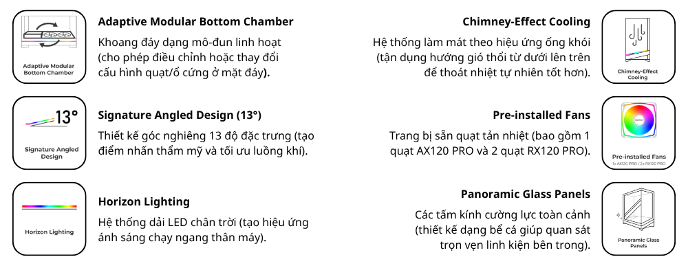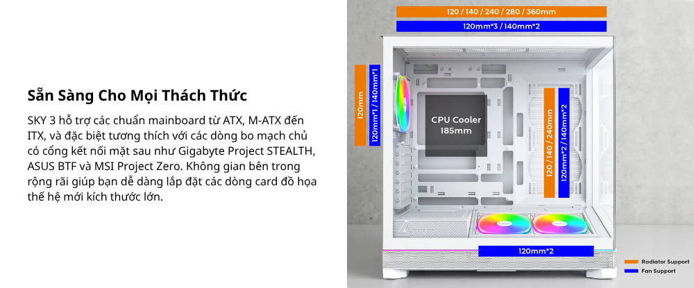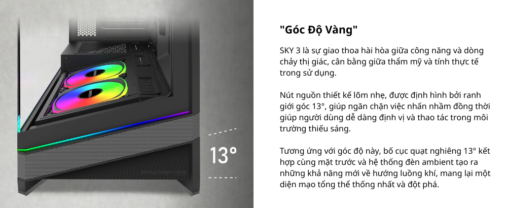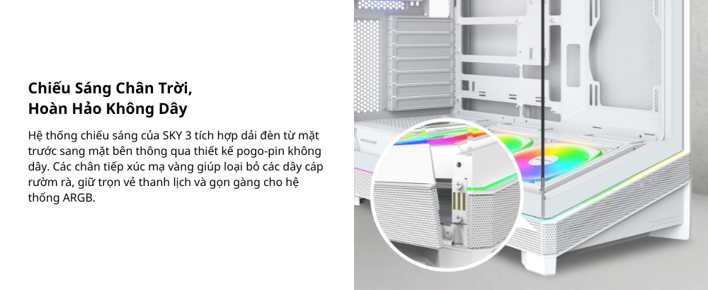 Kế thừa di sản của SKY TWO, SKY 3 mang đến thiết kế khoang đáy có thể hoán đổi mang tính cách mạng cùng hệ thống đèn Pogo-Pin không dây. Tối ưu cho các dòng mainboard back-connect và GPU RTX 50-Series, sản phẩm kết hợp hoàn hảo giữa hiệu năng đón đầu tương lai và vẻ ngoài tối giản, tinh tế.